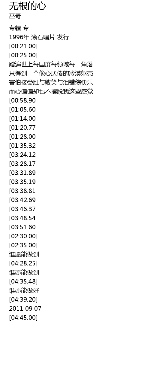 | [03:02.76][01:20.77] | 无根的心要满足这个我再不感到 |