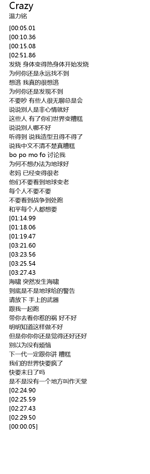 | [03:31.76][03:23.56][03:14.78][03:07.00][01:34.12][01:25.60] | crazy 不想要 |