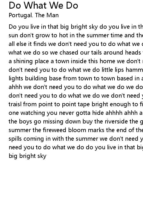 Do you live in that big bright sky do you live in that big bright sky where the sun don't grow to hot in the summer time and the moon watched chase to hanes and all else it finds we don't need you to do what we do we don't need you to do what we do so we chased our tails around heads were all we found in those heads a shining place a town inside this home we don't need you to do what we do we don't need you to do what we do little lips hammers for fists eyes were little lights building base from town to town based in another town ahhhh ahhh ahhh ahhh we don't need you to do what we do we don't need you to do what we do we don't need you to do what we do we don't need you to do what we do mark the traisl from point to point tape bright enough to find when the moons the only one watching you never gotta hide ahhhh ahhh ahhh ahhh we don't need you when the boys go missing down buy the riverside the grass don't grow to tall in the summer the fireweed bloom marks the end of the summer time while the willow down spills coming in with the summer we don't need you to do what we do we don't need you to do what we do do you live in that big bright sky do you live in that big bright sky |