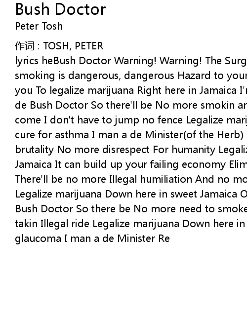 | lyrics heBush Doctor Warning! Warning! The Surgeon General warns Cigarette smoking is dangerous, dangerous Hazard to your health Does that mean anything to you To legalize marijuana Right here in Jamaica I'm say it cure glaucoma I man a de Bush Doctor So there'll be No more smokin and feelin tense When I see them a come I don't have to jump no fence Legalize marijuana Down here in Jamaica Only cure for asthma I man a de Minister(of the Herb) So there'll be no more Police brutality No more disrespect For humanity Legalize marijuana Down here in Jamaica It can build up your failing economy Eliminate the slavish mentality There'll be no more Illegal humiliation And no more police Interrogation Legalize marijuana Down here in sweet Jamaica Only cure for glaucoma I man a de Bush Doctor So there be No more need to smoke and hide When you know you're takin Illegal ride Legalize marijuana Down here in Jamaica It the only cure for glaucoma I man a de Minister Re |