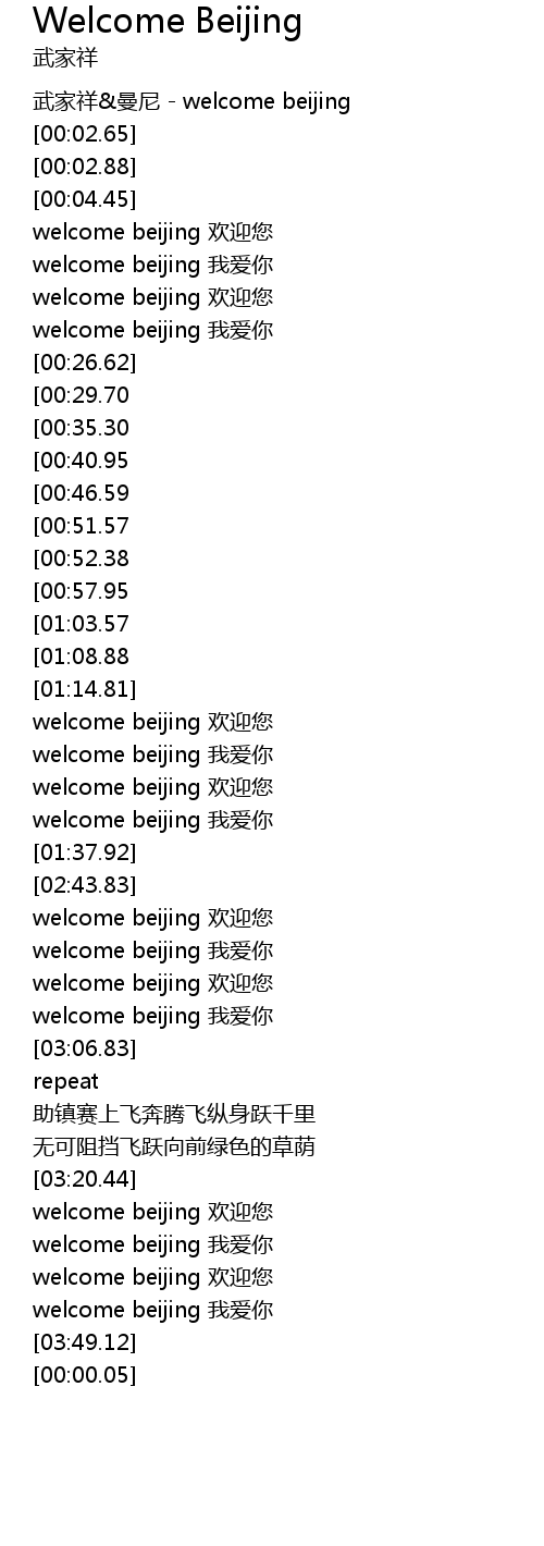 | [00:01.32] | 武家祥&曼尼 - welcome beijing |