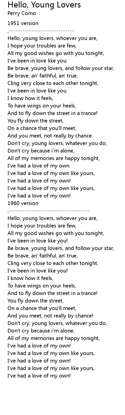 Hello, young lovers, whoever you are, |