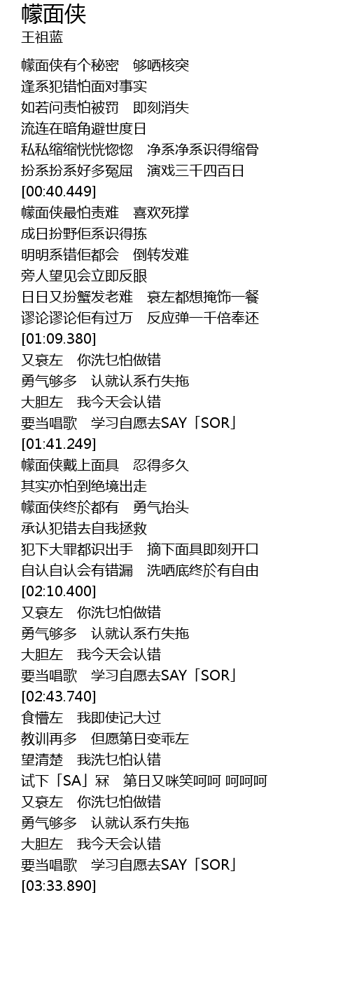 | [00:43.169] | 幪面侠最怕责难 喜欢死撑 |