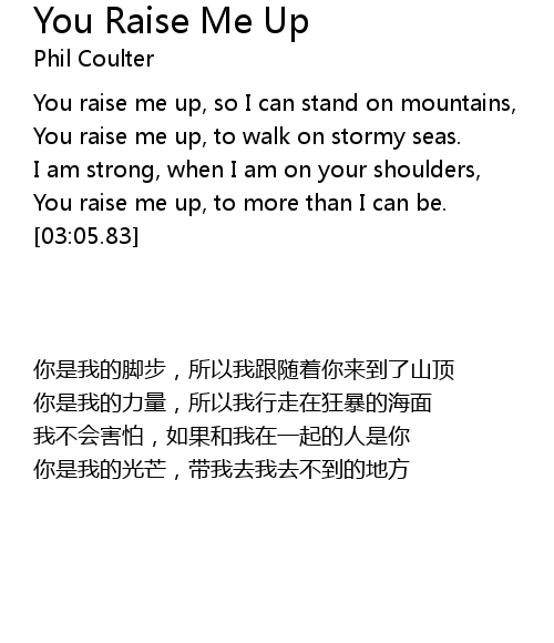 | [02:58.82] | You raise me up, to more than I can be. |