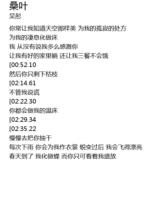 | [02:03.54][00:52.10] | 你是我的桑叶 让我慢慢吞食你 然后你只剩下枯枝 |