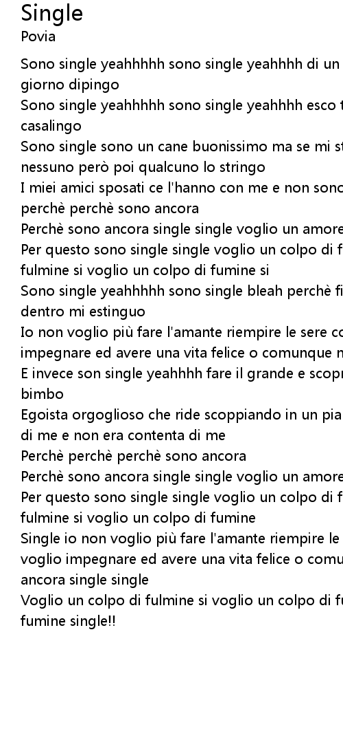 | Single io non voglio più fare l'amante riempire le sere coi vuoti di mente mi voglio impegnare ed avere una vita felice o comunque normale e invece sono ancora single single | |