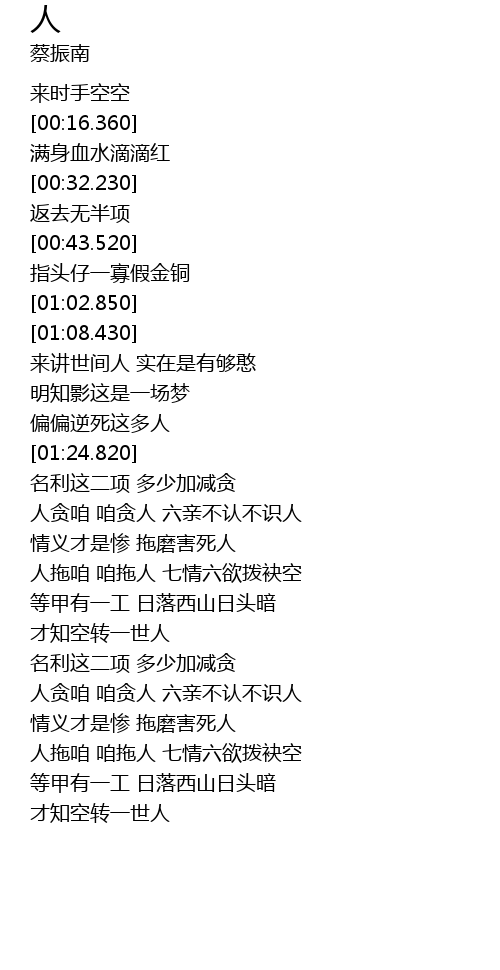 | [01:35.480] | rén tān zán zán tān rén liù qīn bù rèn bù shí rén |
