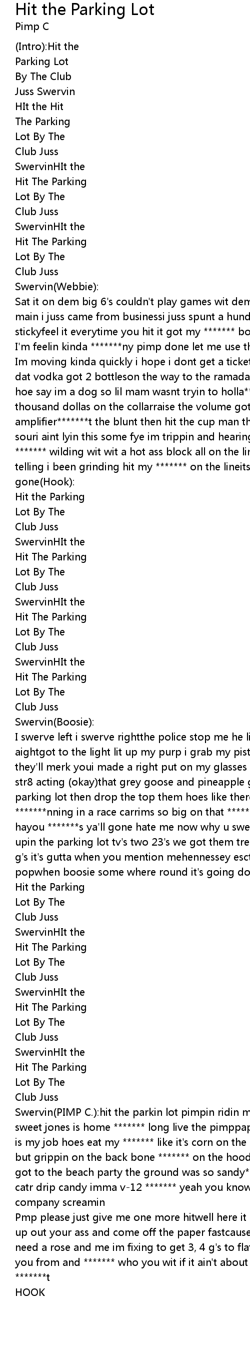 Swervin(PIMP C.):hit the parkin lot pimpin ridin my name with the pimpinsaid sweet jones is home ******* long live the pimppaper stackin durty cause stunting is my job hoes eat my ******* like it's corn on the cobaint nothin happening, but grippin on the back bone ******* on the hood and i'm ballin in the stacksi got to the beach party the ground was so sandy******* on my ******* cause my catr drip candy imma v-12 ******* yeah you know that we the *******trecord company screamin |