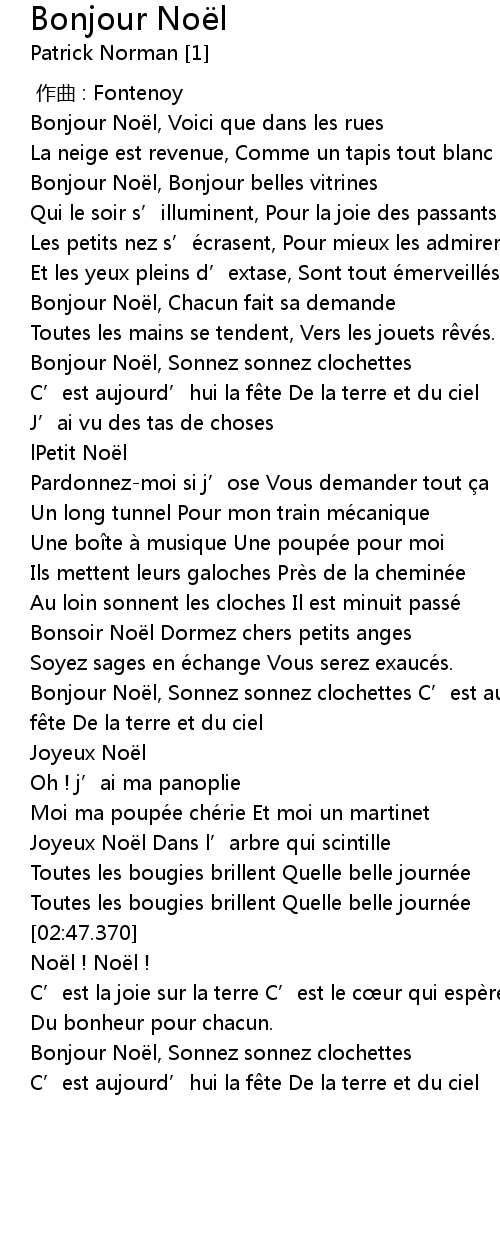 | [01:57.580] | Bonjour Noël, Sonnez sonnez clochettes C’est aujourd’hui la fête De la terre et du ciel |