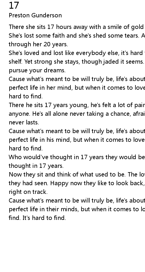 Cause what's meant to be will truly be, life's about the journey. They live a perfect life in their minds, but when it comes to love you know it's hard to find. It's hard to find. |