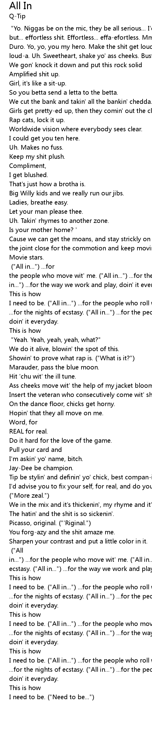 | High Define your screen and put this brotha in it. [Q-Tip (Meda Leacock)] ("All in...") ...for the people who move wit' me. ("All in...") ...for the nights of ecstasy. ("All in...") ...for the way we work and play, doin' it everyday. | |