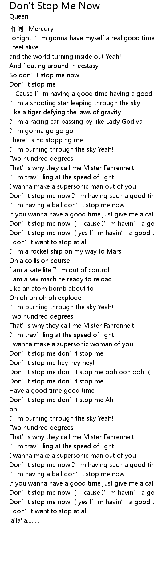 | [00:25.40] | So don' t stop me now |