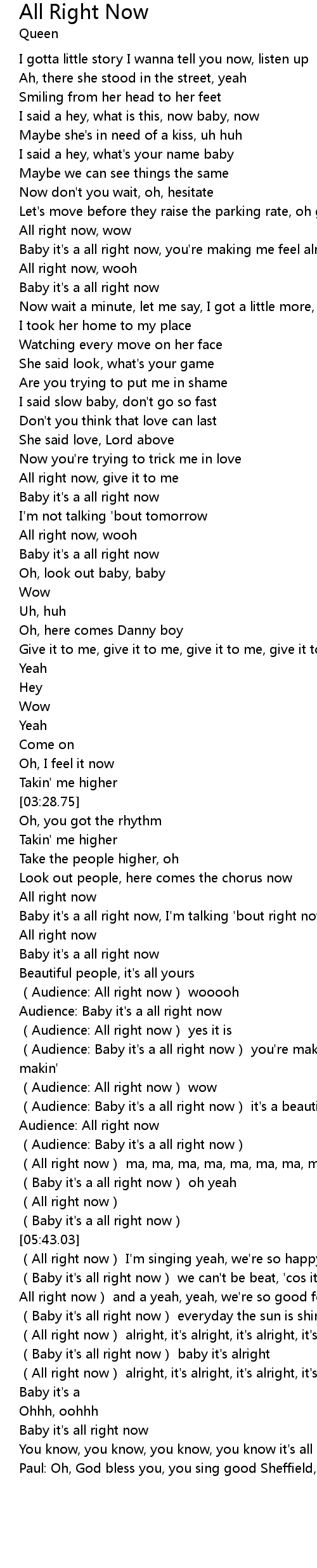 | [05:22.81] | (Audience: Baby it's a all right now) |