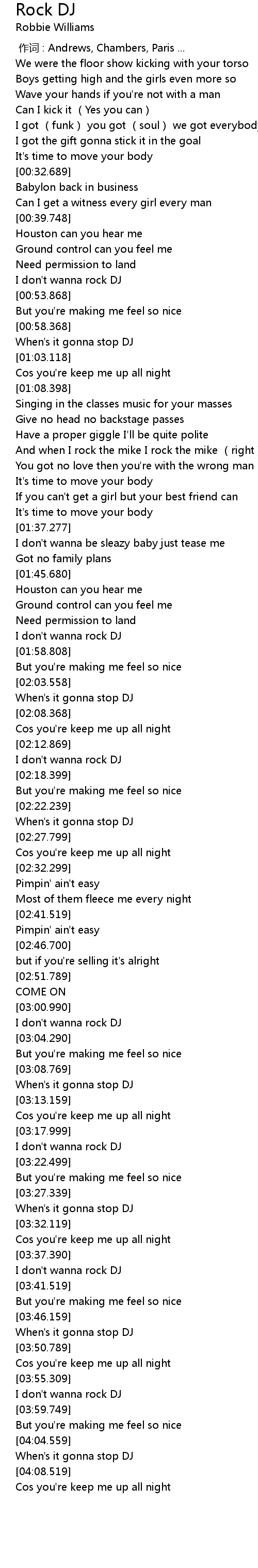 | [04:05.799] | When' s it gonna stop DJ |