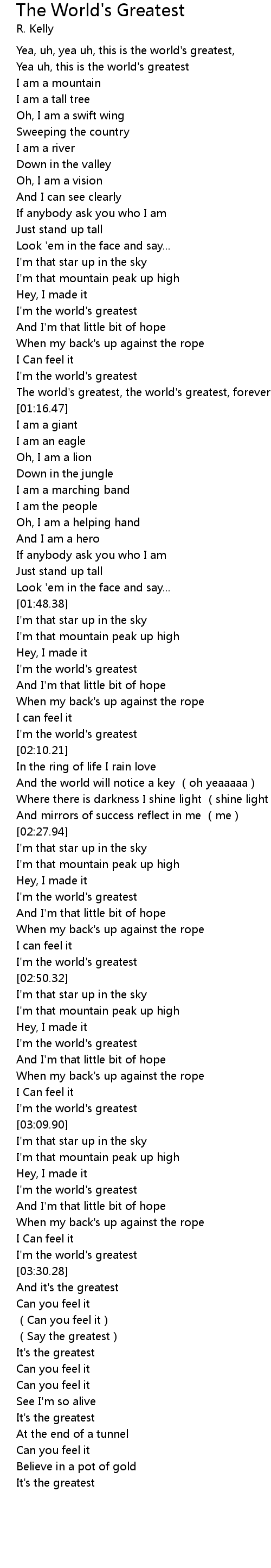 | [01:12.45] | The world's greatest, the world's greatest, forever |