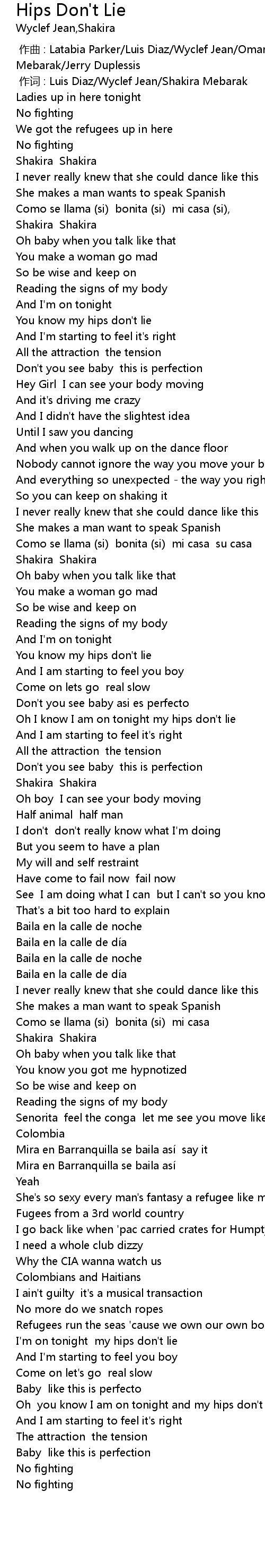 | [00:00.00] | 作曲 : Latabia Parker/Luis Diaz/Wyclef Jean/Omar Alfanno/Shakira Mebarak/Jerry Duplessis |