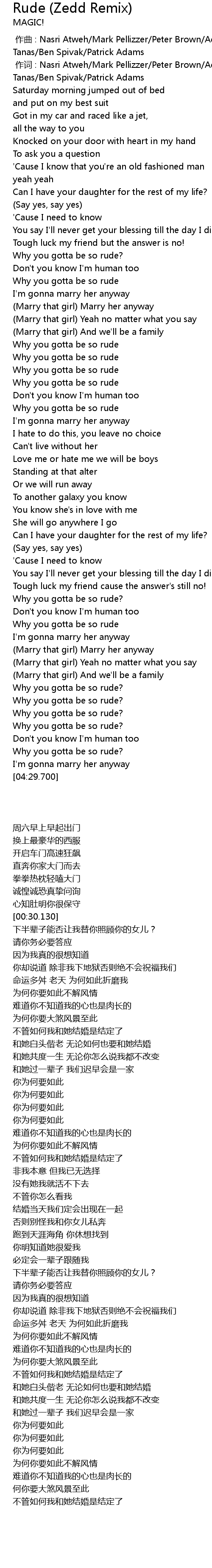| [00:01.00] | 作词 : Nasri Atweh/Mark Pellizzer/Peter Brown/Adam Messinger/Alex Tanas/Ben Spivak/Patrick Adams |