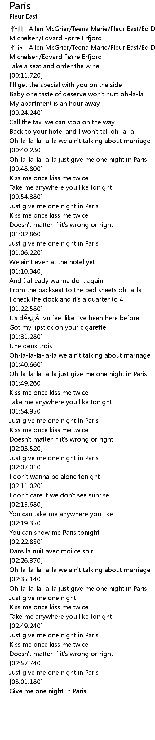 | [02:36.780] | Oh-la-la-la-la-la just give me one night in Paris |