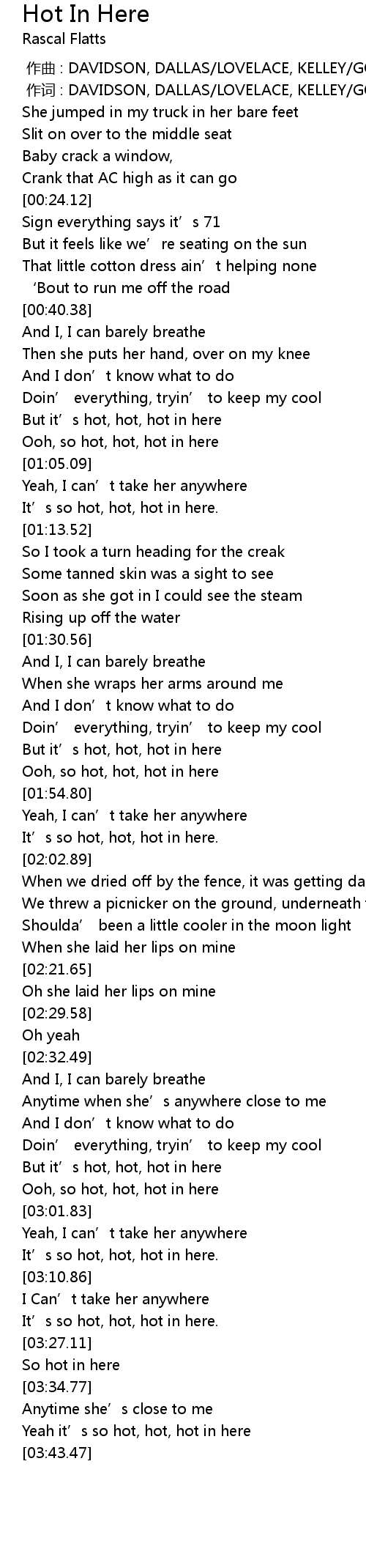 | [03:40.19] | Yeah it’s so hot, hot, hot in here |