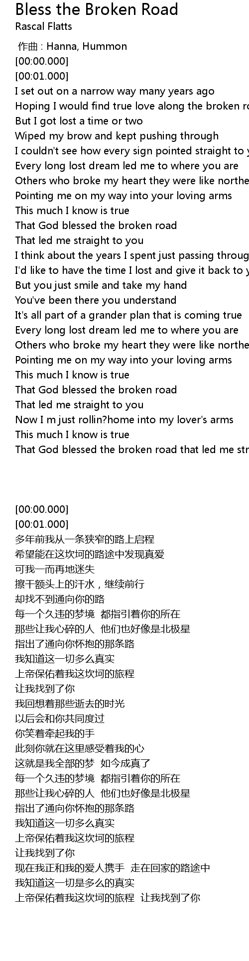 | [02:24.280] | That God blessed the broken road |
