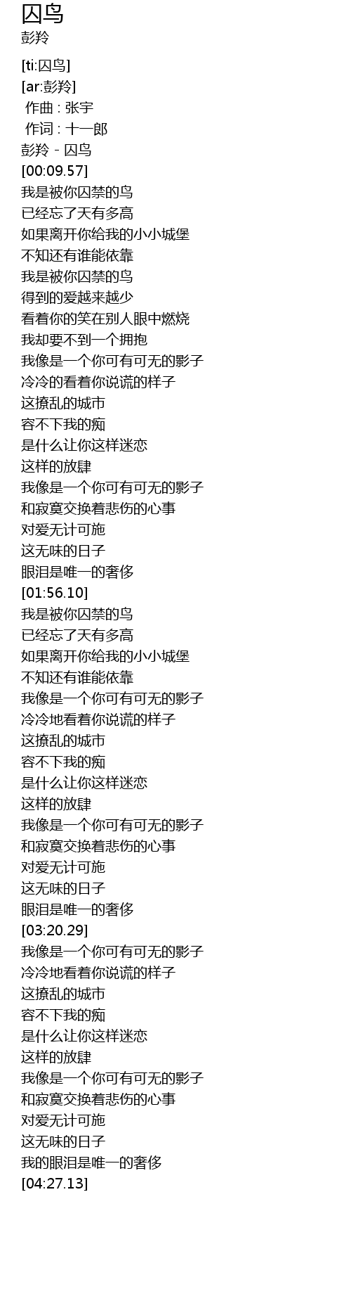 | [00:01.27] | 彭羚 - 囚鸟 |