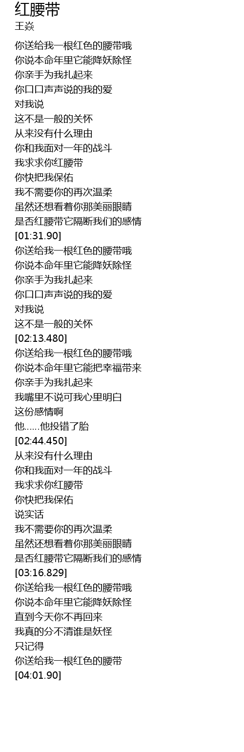 | [00:25.320] | 你送给我一根红色的腰带哦 |
