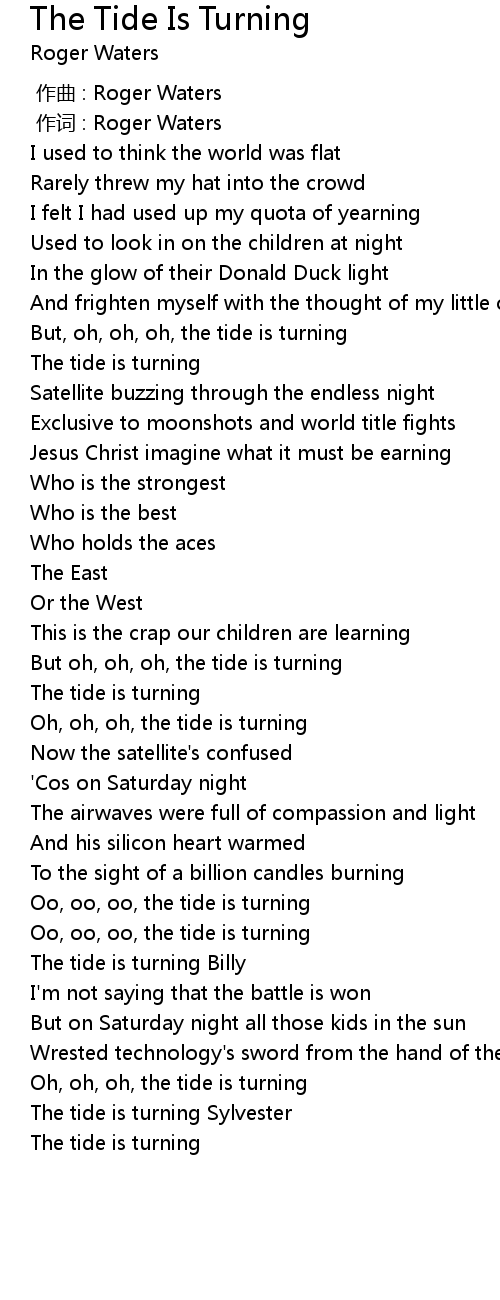 | [01:06.570] | But, oh, oh, oh, the tide is turning |
