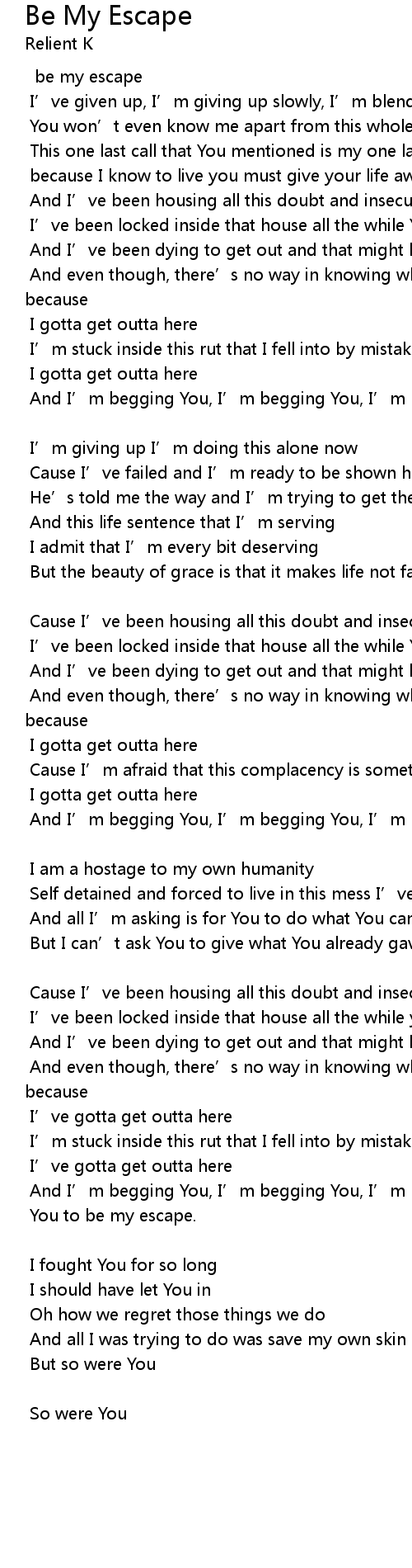 | And I' m begging You, I' m begging You, I' m begging You to be my escape. | |