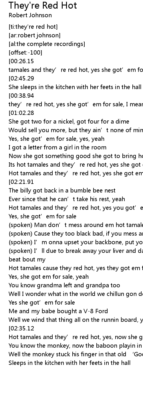 | [00:06.54][00:26.15][00:45.40][01:23.24][01:41.85][02:00.37][02:18.68][02:37.42] | Hot tamales and they’re red hot, yes she got’em for sale |