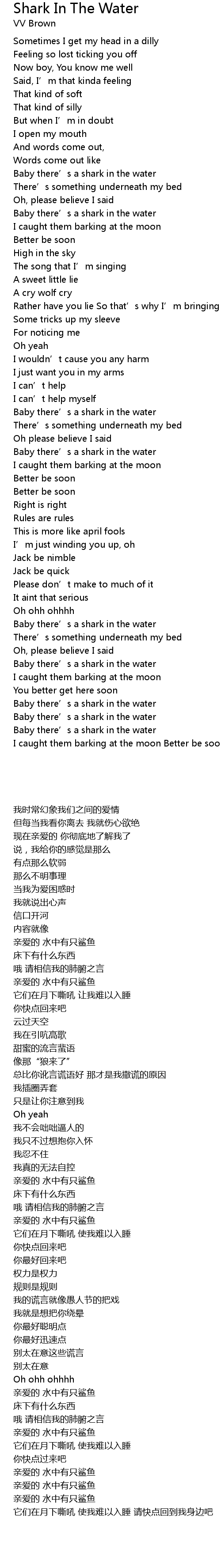 | [02:21.46] | Baby there' s a shark in the water |