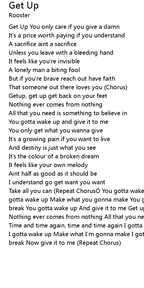 | Take all you can Repeat Chorus You gotta wake up Take what you wanna take You gotta wake up Make what you gonna make You gotta wake up Break what you wanna break You gotta wake up And give it to me Get up, get up get back on your feet Nothing ever comes from nothing All that you need is something to believe in Time and time again, time and time again I gotta wake up Take what I wanna take I gotta wake up Make what I' m gonna make I gotta wake up Break what I wanna break Now give it to me Repeat Chorus |