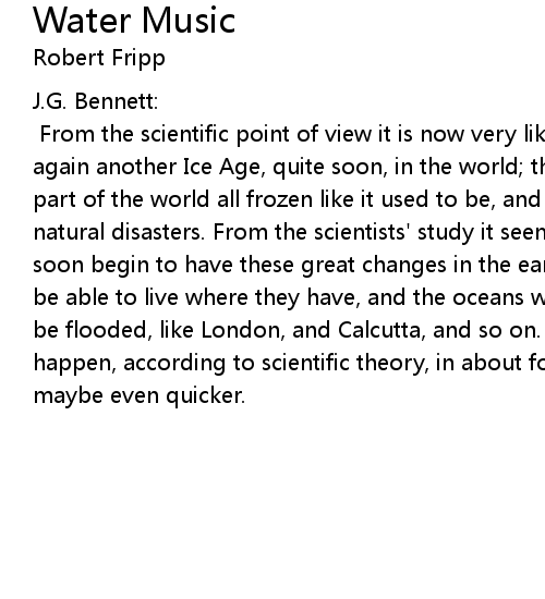 From the scientific point of view it is now very likely that there will be again another Ice Age, quite soon, in the world; that we shall have the north part of the world all frozen like it used to be, and we're beginning to have natural disasters. From the scientists' study it seems likely that we should soon begin to have these great changes in the earth's climate so people will not be able to live where they have, and the oceans will rise, and many cities will be flooded, like London, and Calcutta, and so on. These things, they say, will happen, according to scientific theory, in about forty years at the most, but maybe even quicker. |
