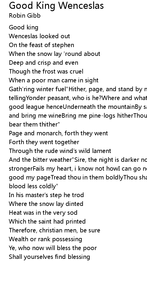 And the bitter weather"Sire, the night is darker nowAnd the wind blows strongerFails my heart, i know not howI can go no longer""Mark my footsteps, good my pageTread thou in them boldlyThou shall find the winter's rageFreeze thy blood less coldly" |