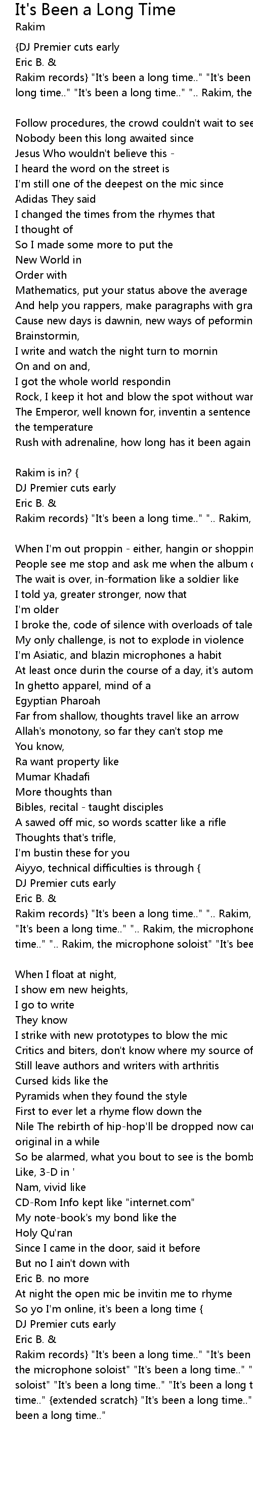 | Rakim records} "It's been a long time.." "It's been a long time.." ".. Rakim, the microphone soloist" "It's been a long time.." ".. Rakim, the microphone soloist" "It's been a long time.." "It's been a long time.." "It's been a long time.." {extended scratch} "It's been a long time.." {extended scratch} "It's been a long time.." |