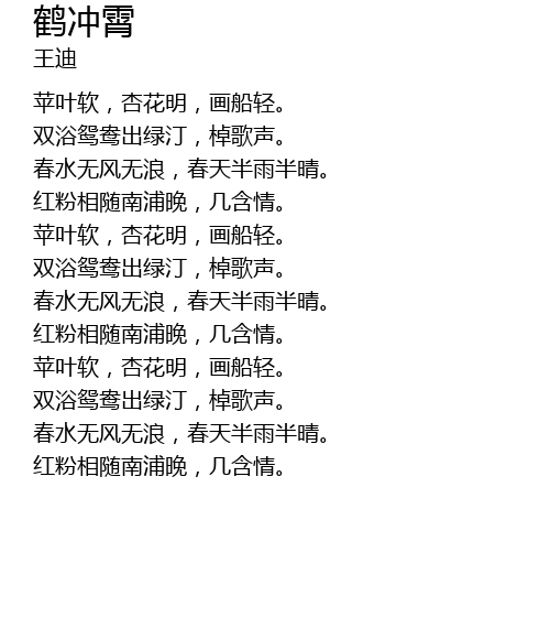 | [02:08.298] | 苹叶软,杏花明,画船轻。 |
