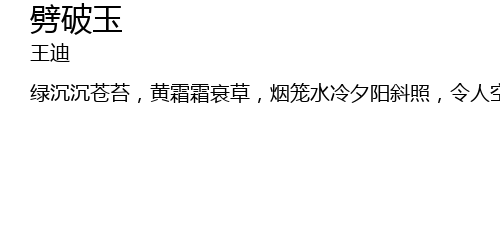 | lv chen chen cang tai, huang shuang shuang shuai cao, yan long shui leng xi yang xie zhao, ling ren kong shang huai bao. leng qing qing xiu fang, jiao di di ren er, zen jing de feng yu xiao xiao. ai! bei qie qie han ya, liao liang liang bin hong, ku ai ai zhi ren chuang qian xiang cang cang pin jiao, cui zhu, ding dong dong tie ma, wu xiu wu xie, you bei jin feng chui yao. gu ling ling ren er, yuan tiao tiao qu le, you bu zhi shi na yi ri cai ba shu xin shao. chou yan yan xin xu, ting duan xu zhen sheng, zen neng bu qian dong ren fan nao. zha meng long, shi cai hun chen chen shui qu, hu tu tu xing lai, you bu zhi shi huang hun, you bu zhi shi xiao. chou yan yan xin xu, ting duan xu zhen sheng, zen neng bu qian dong ren fan nao. zha meng long, shi cai hun chen chen shui qu, hu tu tu xing lai, you bu zhi shi huang hun, you bu zhi shi xiao. |
