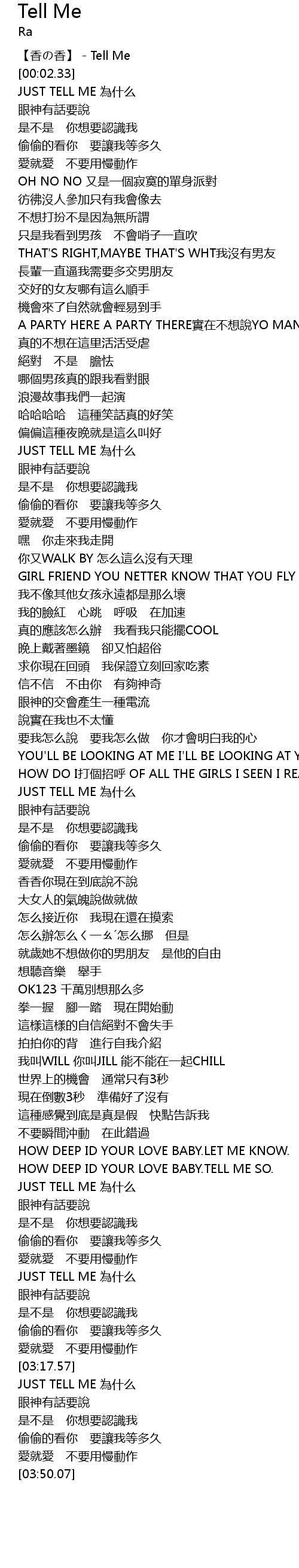| [03:31.72] | JUST TELL ME wèi shén me |