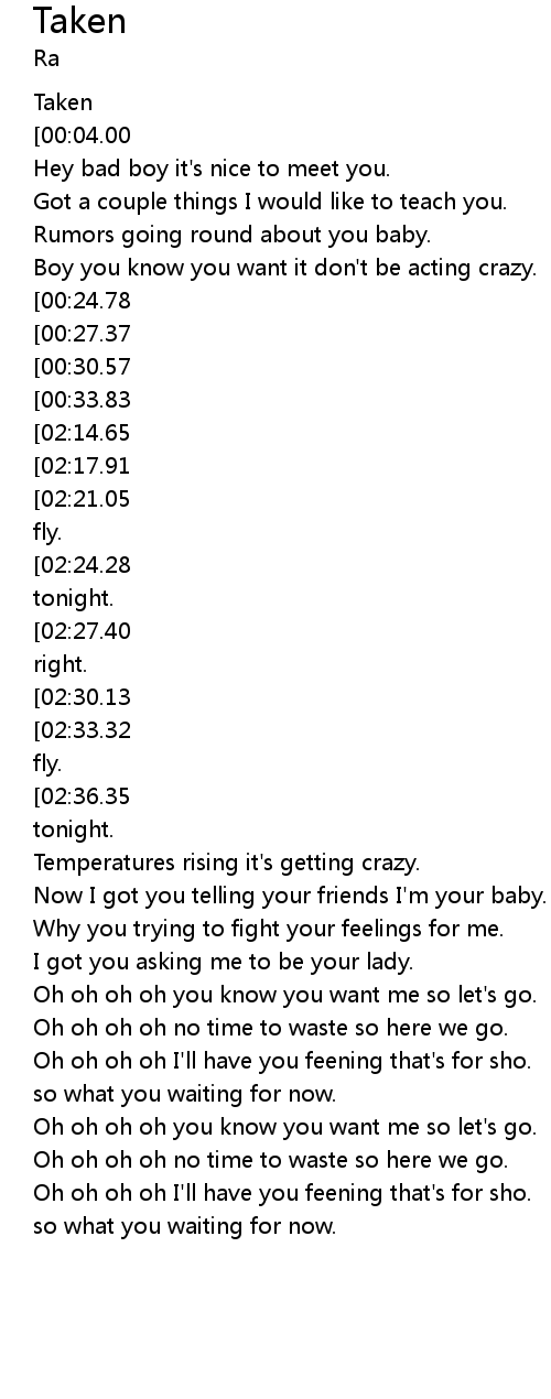 | [03:00.83][02:36.35][01:47.57][00:58.26] | Yo you know I got a man but it's on tonight. |