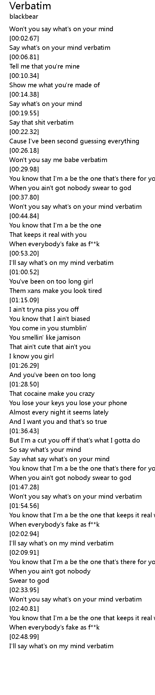 | [02:51.65] | I'll say what's on my mind verbatim |