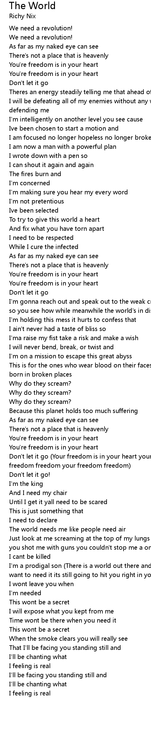 | I'm gonna reach out and speak out to the weak crowd that needs help from me now so you see how while meanwhile the world's in distress | |