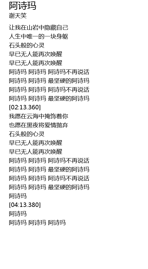 | [01:57.860] | 阿诗玛 阿诗玛 阿诗玛不再说话 |