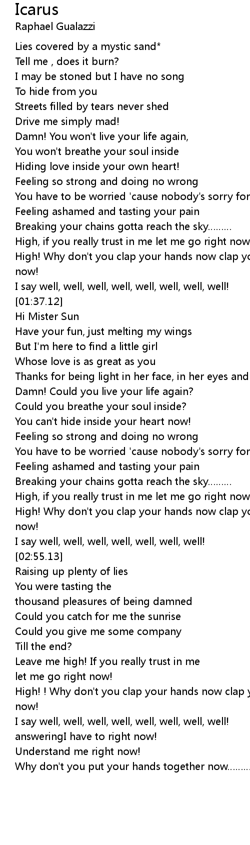| [01:23.23] | High, if you really trust in me let me go right now |