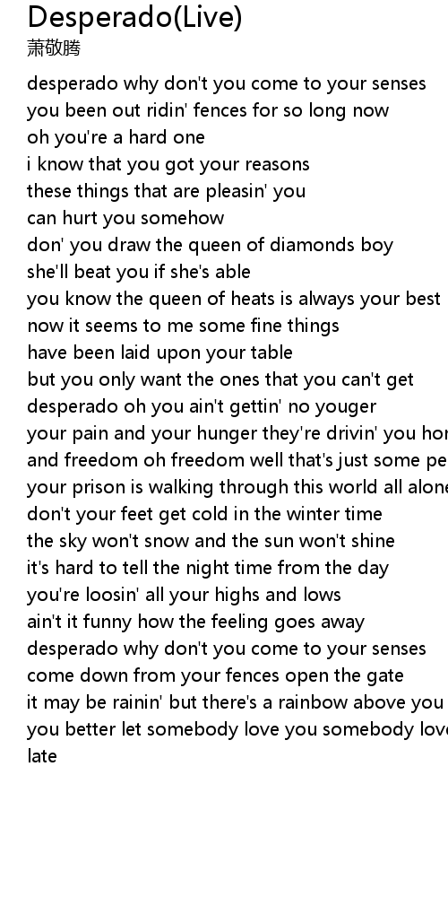 desperado oh you ain't gettin' no youger |