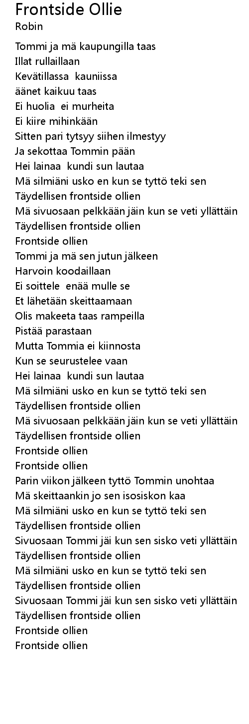 | [02:02.95] | Mä skeittaankin jo sen isosiskon kaa |