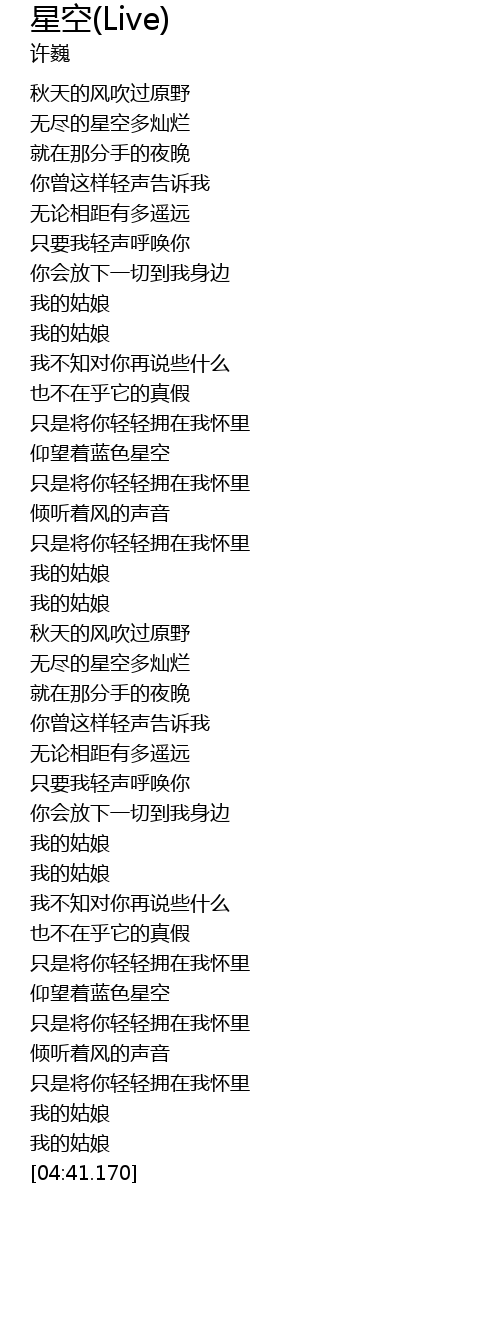 | [03:06.850] | 无尽的星空多灿烂 |