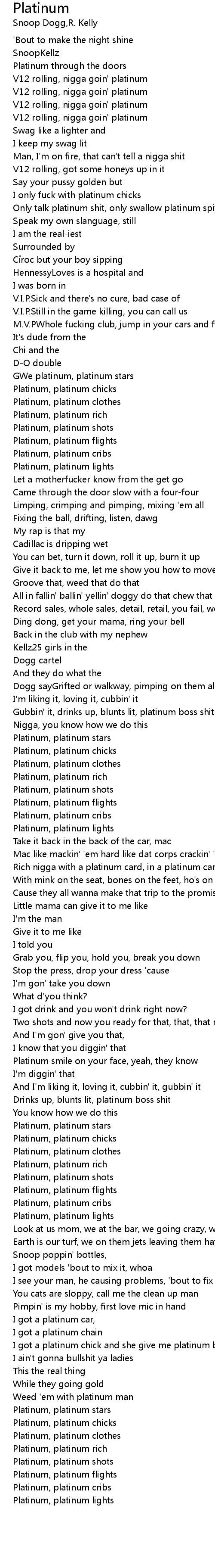 | Gubbin' it, drinks up, blunts lit, platinum boss shit | |