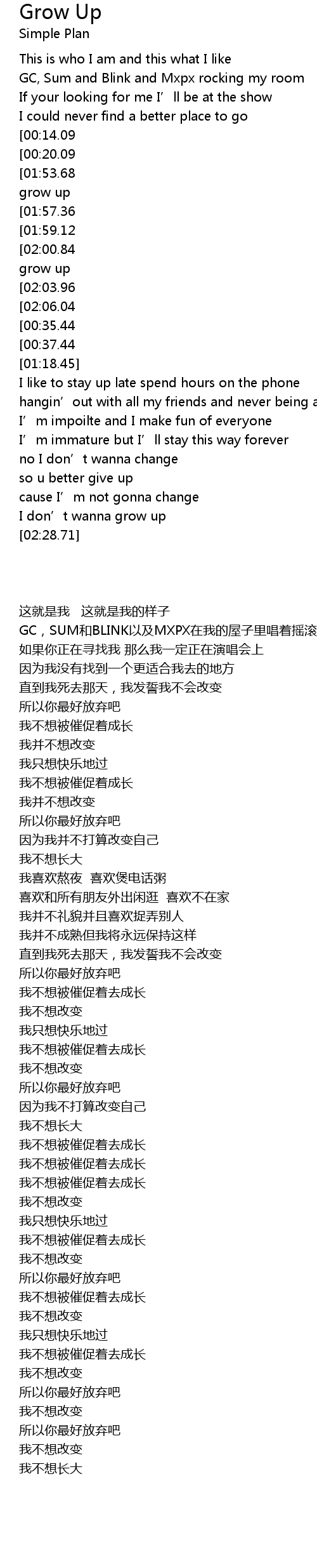 | [01:15.60][00:37.44] | I don' t wanna grow up |