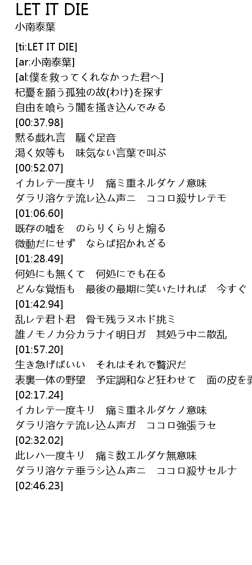 | [02:38.61] | ダラリ溶ケテ垂ラシ込ム声ニ ココロ殺サセルナ |