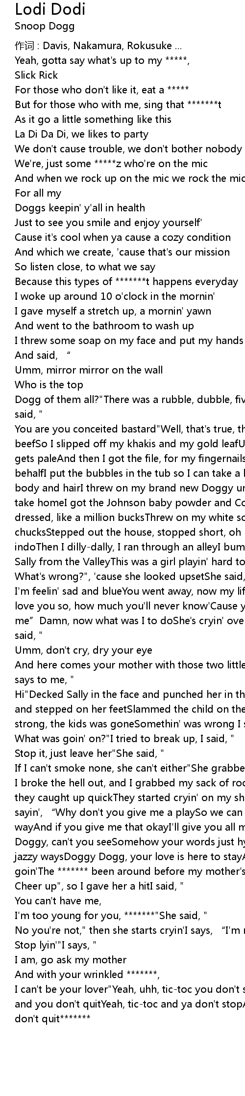 | If I can' t smoke none, she can' t either" She grabbed my closely by my socksAnd so I broke the hell out, and I grabbed my sack of rock ut um, they gave chase, they caught up quickThey started cryin' on my shoes and grabbin' my And sayin', " Why don' t you give me a playSo we can break it down the Long Beach wayAnd if you give me that okayI' ll give you all my love today" Doggy, Doggy, Doggy, can' t you seeSomehow your words just hypnotize meAnd I just love your jazzy waysDoggy Dogg, your love is here to stayAnd on and on and on she kept goin' The been around before my mother' s bornI said, " | |