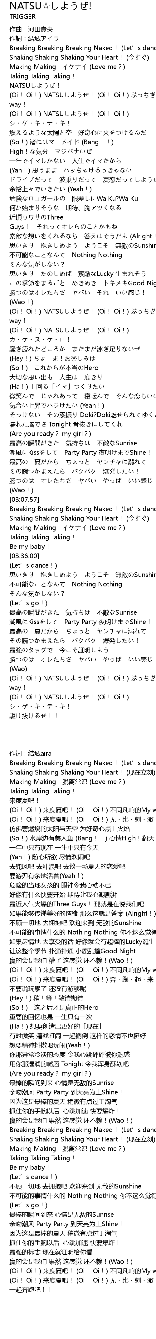 | [01:49.59] | (Oi! Oi!) NATSUしようぜ! (Oi! Oi!) カ・ケ・ヌ・ケ・ロ! |